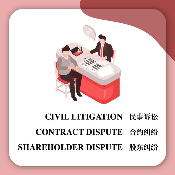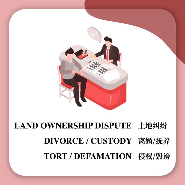 Civil litigation include debt collection, contract dispute, tort, land dispute, matrimonial proceedings, law of successions (estate).
